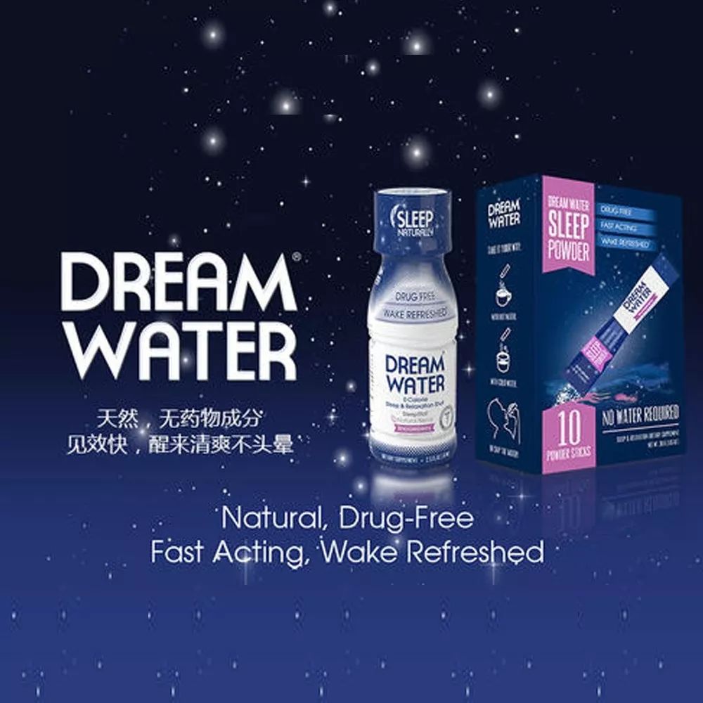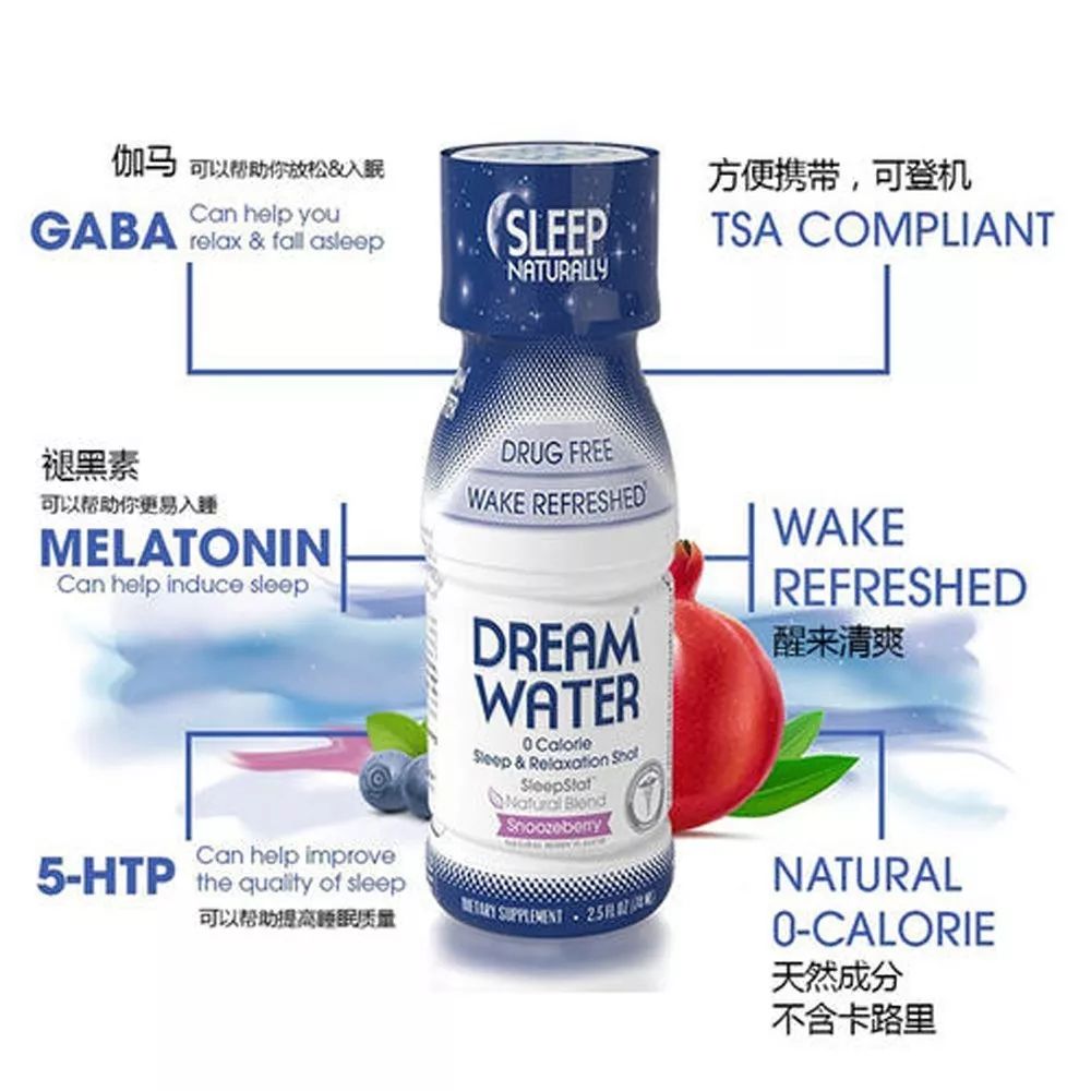 美國(guó)的Dream Water Sleep睡眠水,“該產(chǎn)品為全天然成分,0卡路里,不含藥物成分,是一款用于睡眠和放松的飲料。GABA幫助放松并減輕焦慮情緒,褪黑素、5-HTP幫助入眠。”是一款無(wú)麩質(zhì)的水狀睡眠輔助劑。