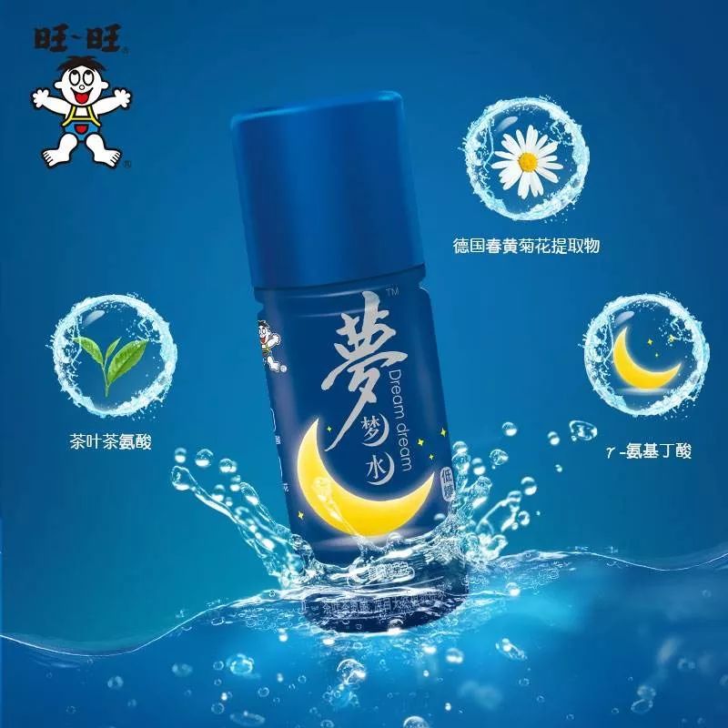 2018年,旺旺就推出了這款創(chuàng)新產(chǎn)品“夢(mèng)夢(mèng)水”。今年通過(guò)對(duì)產(chǎn)品包裝調(diào)整,突出了代表睡眠的月亮標(biāo)識(shí)后,正式上市。該產(chǎn)品特別添加了茶葉茶氨酸、德國(guó)春黃菊花提取物、γ-氨基丁酸,不僅改善睡眠,更是低糖、0脂肪的一款風(fēng)味飲料。