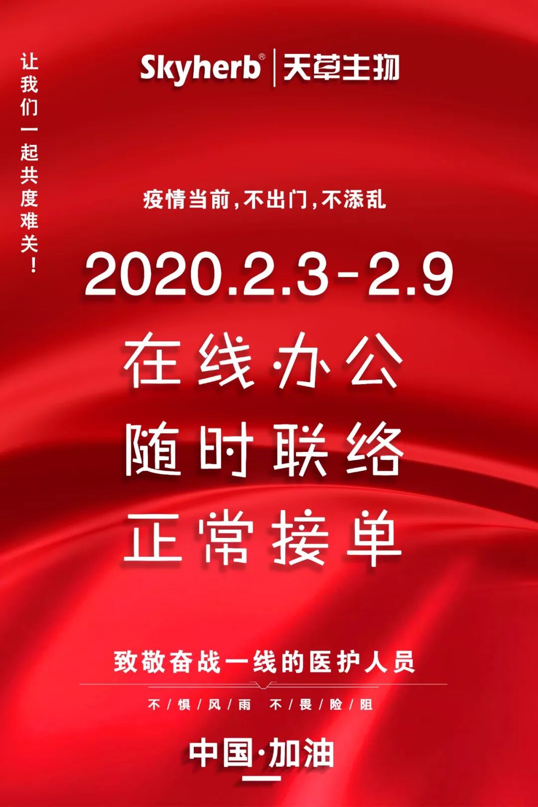 今日(2月3日),天草全體員工已開啟在線辦公模式,隨時(shí)保持與合作伙伴的聯(lián)絡(luò),疫情當(dāng)前,我們一起努力!