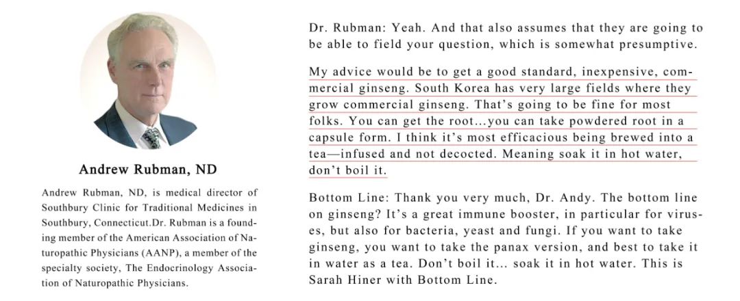美國(guó)自然療法醫(yī)師協(xié)會(huì)(AANP)的創(chuàng)始成員,康涅狄格州Connecticut Southbury傳統(tǒng)醫(yī)學(xué)診所的醫(yī)學(xué)主任,Andrew Rubman,曾受Bottomline采訪特地指出,人參乃是超級(jí)免疫力助推器。他明確地指出,人參可以幫助組織細(xì)胞更好地交流,并建立一個(gè)共同的防御來(lái)抵御外來(lái)威脅。它的作用方式更像是一個(gè)社區(qū)組織者,把人們集合起來(lái)做出回應(yīng),更像是VC的覆蓋。(Ginseng is used because it helps the community of cells in a tissue line better communicate and establish a common defenseagainst what the threat is. It works as an overlay to vitamin C. It works almost like a community organizer to rally peoplecollectively, to respond.)