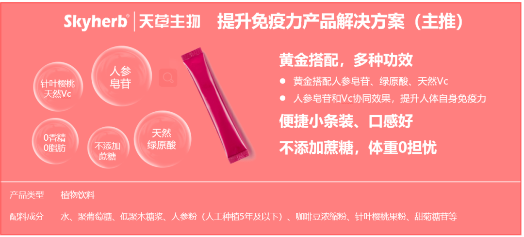 天草根據(jù)自身多年對(duì)功能性植物原料的理解與研究,已開(kāi)發(fā)出一套基于人參皂苷的提升免疫力產(chǎn)品解決方案,可以依據(jù)客戶需求,搭配不同功效成分定制差異化的配方。