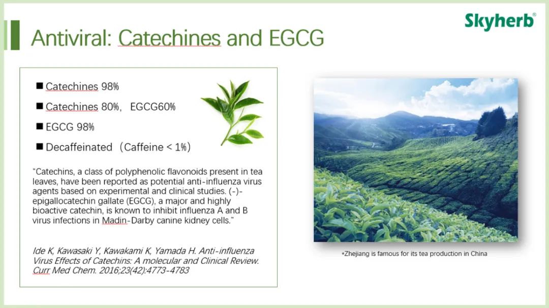 Multiple studies have pointed to green tea, especially its catechines’ potential benefits in preventing influenza. A 2016 review concluded that catechines and EGCG may inhibit influenza A and B infections. Skyherb prides itself in being the 2nd-largest producer of green tea extracts. We supply a full range of green tea extracts with catechines and EGCG, which have been widely recognized in the studies. In addition to the conventional extracts, we also have: