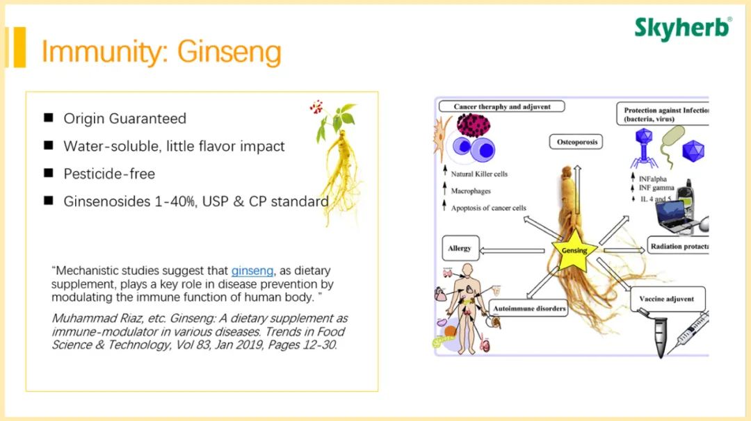 Ginseng has long been used as a supplement to boost immunity. Again, its efficacy has been studied and confirmed in multiple essays. A latest review published on Trends in Food Science and Technology concluded that ginseng modulated immune function of our body to prevent disease. Since the out break of COVID-19, we have also observed a strong demand for ginsengextracts. We see 3 challenges with the product: