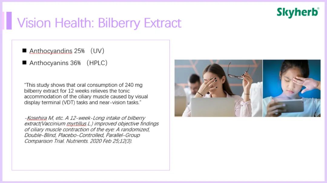 Last but not least, the new online learning and working pattern leads to extended screen time that will strain our eyes, Indeed, the transition to e-learning and working during COVID-19 social distancing measures makes eye health formulations for people of all ages. Bilberry has long been proved to help protection our vision health,and it is still being studied by researchers now, as shown in a 2020 essay from Nutrients. Our edge with this classical ingredient is our scale and cost. Thanks to our close relationship with our partners in Europe, we are able to accommodate both the 25% and 36% grade, at a competitive price while securing stable supply.