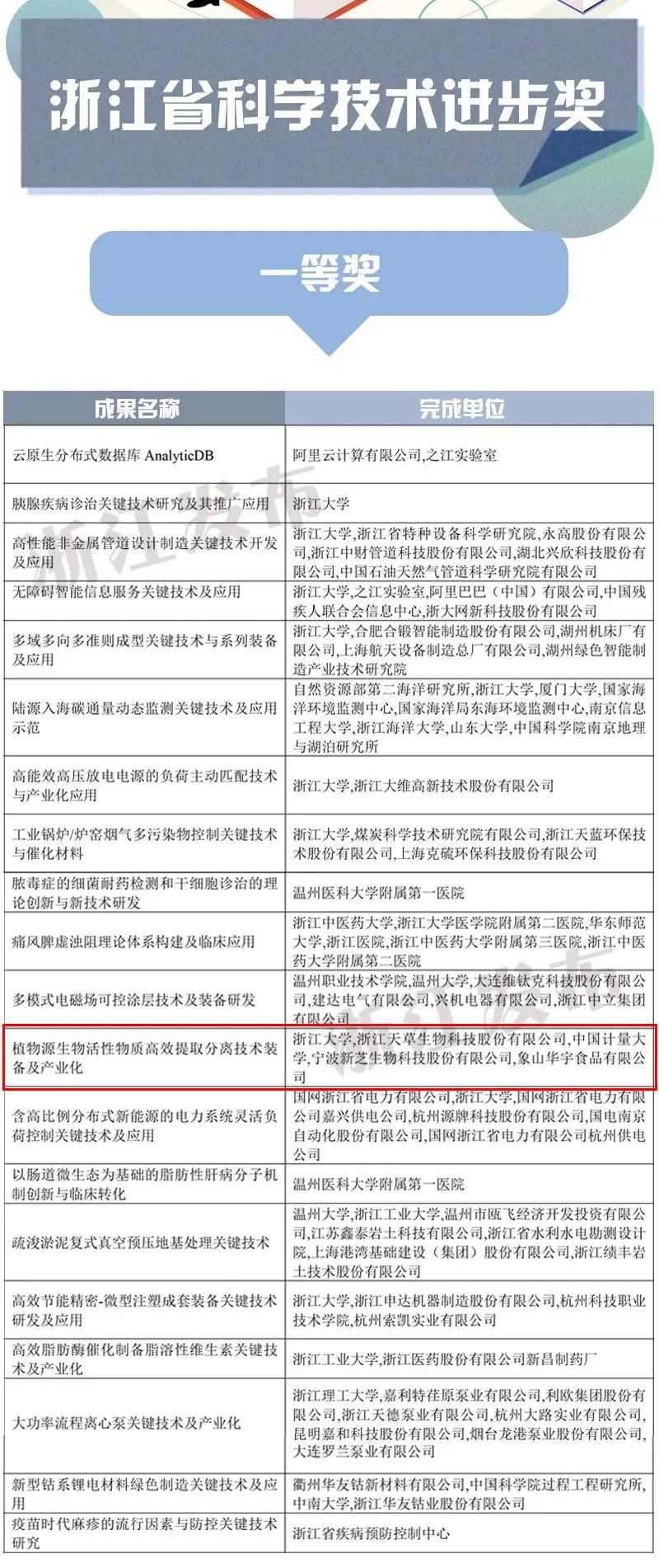 其中,浙江天草生物科技股份有限公司與合作單位(浙江大學(xué)、中國計(jì)量大學(xué)等)的項(xiàng)目《植物源生物活性物質(zhì)高效提取物分離技術(shù)裝備及產(chǎn)業(yè)化》榮獲科學(xué)技術(shù)進(jìn)步獎一等獎。