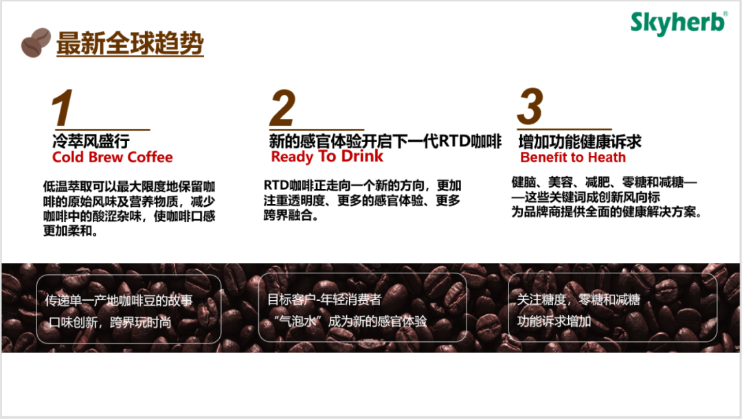 近年來,咖啡作為全球第一大飲料,不僅在歐美市場不斷改變創(chuàng)新,而且在中國和日本等亞洲國家也在向著健康和功能化的方向發(fā)展。閻教授首先從全球趨勢指出,近年來全球咖啡市場日趨多樣化,主要體現(xiàn)在冷萃風(fēng)盛行、追求新的感官體驗(yàn)、增加功能訴求這3個(gè)方面,咖啡飲料在低糖、健康,天然和功能性等方面被廣泛關(guān)注。