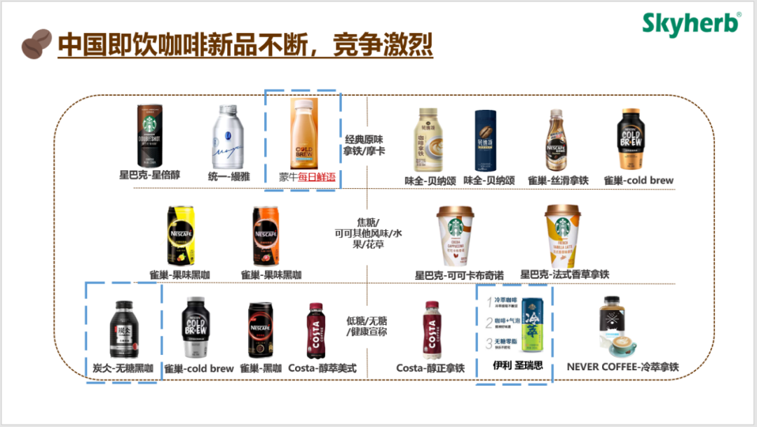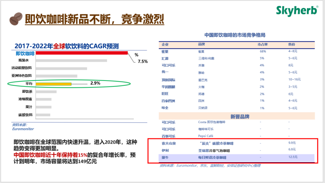 我們看到中國市場,速溶咖啡占比52.4%,現(xiàn)磨咖啡(星巴克、瑞幸等)打得火熱,市場份額占到36.5%,而即飲咖啡在中國市場快速升溫,各大品牌相繼推出即飲咖啡產(chǎn)品,主要是看好消費(fèi)升級大環(huán)境下即飲咖啡市場的紅利優(yōu)勢,進(jìn)入2020年,這種趨勢變得更加明顯,中國即飲咖啡近十年保持著15%的復(fù)合年增長率,預(yù)計(jì)到明年,市場容量將達(dá)到149億元。2019年5月,農(nóng)夫山泉推出即飲咖啡產(chǎn)品,即碳酸咖啡“炭仌”,隨后在10月推三款新品,分別是低糖拿鐵、無蔗糖拿鐵和無糖黑咖。2019年7月,伊利再度加碼大健康食品業(yè)務(wù),推出了一款咖啡飲料“圣瑞思”,英文名Sunrelas,寓意為“飽含陽光的咖啡,為你注入滿滿陽光活力”。圣瑞思咖啡選用優(yōu)質(zhì)咖啡豆品種阿拉比卡咖啡豆,帶來醇正咖啡體驗(yàn);同時(shí)加入100%進(jìn)口新西蘭奶源,提供多層次口感享受。2019年9月,蒙牛鮮牛奶品牌“每日鮮語”推出了一款咖啡飲品——冷萃咖啡拿鐵。已在每日鮮語天貓旗艦店上架,每瓶規(guī)格250ml,約11.7元一瓶。跟鮮牛奶產(chǎn)品一樣,這款冷萃咖啡拿鐵也需要冷藏存放,賞味期在15天。